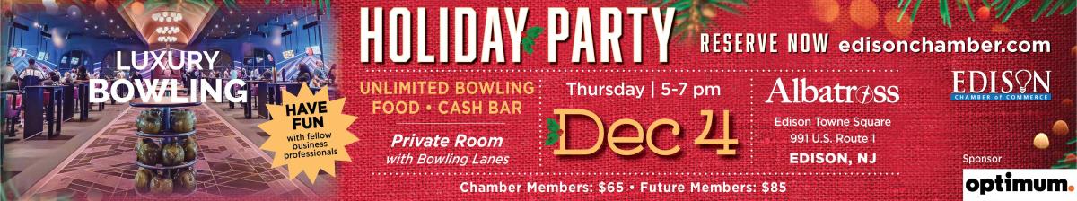 Join us for an evening of festive fun and friendly competition at the Edison Chamber of Commerce 2025 Holiday Party! Celebrate the season in Albatross’s private event space featuring unlimited bowling, delicious food, and a cash bar.